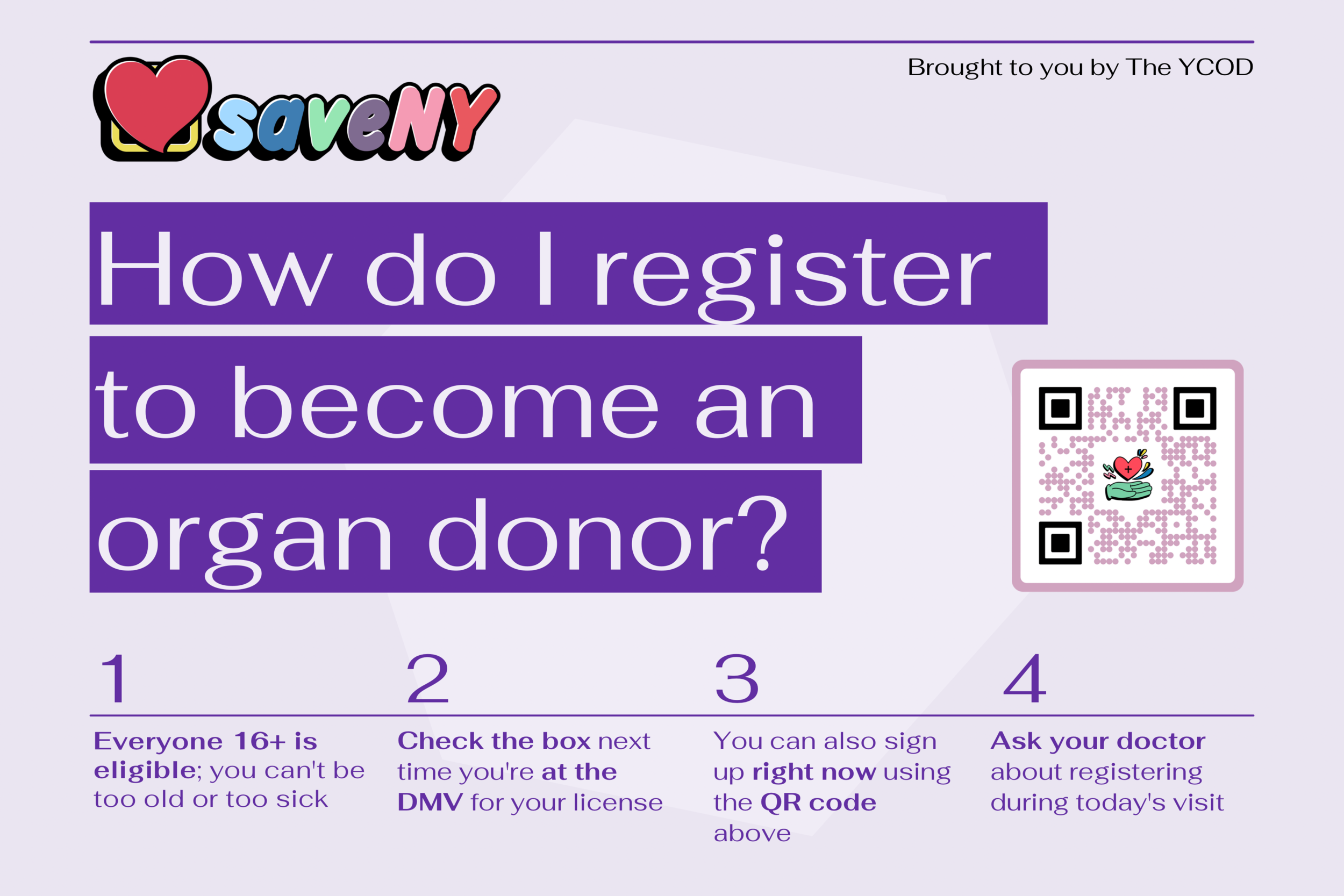 Doctors offices are where New Yorkers of color โ and all New Yorkers โ feel most comfortable discussing organ donation decisions. The ๐ saveNY Campaignโs third stage will include signage for use in primary care offices to encourage the necessary dialogue around organ donation and giving the gift of life. These signs will focus on statistics and data, and will be printed in such a way that makes them desirable to read while waiting in a waiting area or in an office setting. Updated each year, the signs will include relevant and interesting statistics for discussion in a primary care setting, as well as basic directions on signing up at the DMV and through the NYS web form.